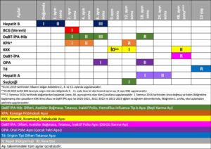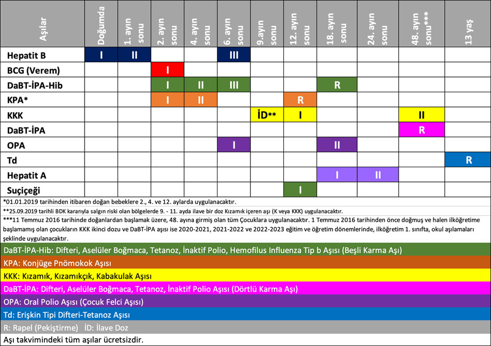 Türkiye’de standart takvimde Hepatit B, BCG, DaBT-IPA-Hib, KPA, KKK gibi aşılar yer alır. Ancak, tam liste için sağlık kuruluşlarına danışılmalıdır. - Çocuğumun yaşı aşı için geçerse ne olur?