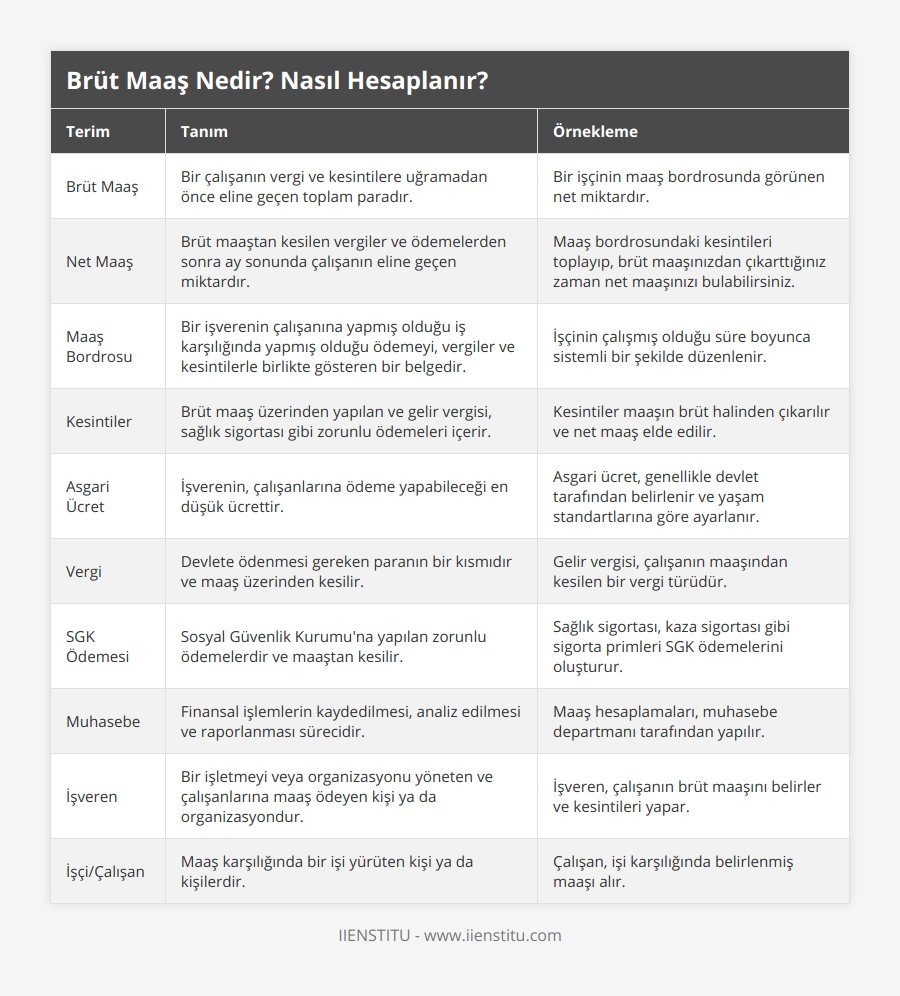 Brüt gelirden genellikle gelir vergisi, sigorta primleri ve diğer yasal kesintiler düşülmektedir. Bunlar, ülkenizdeki yasal düzenlemelere göre değişiklik gösterebilir.